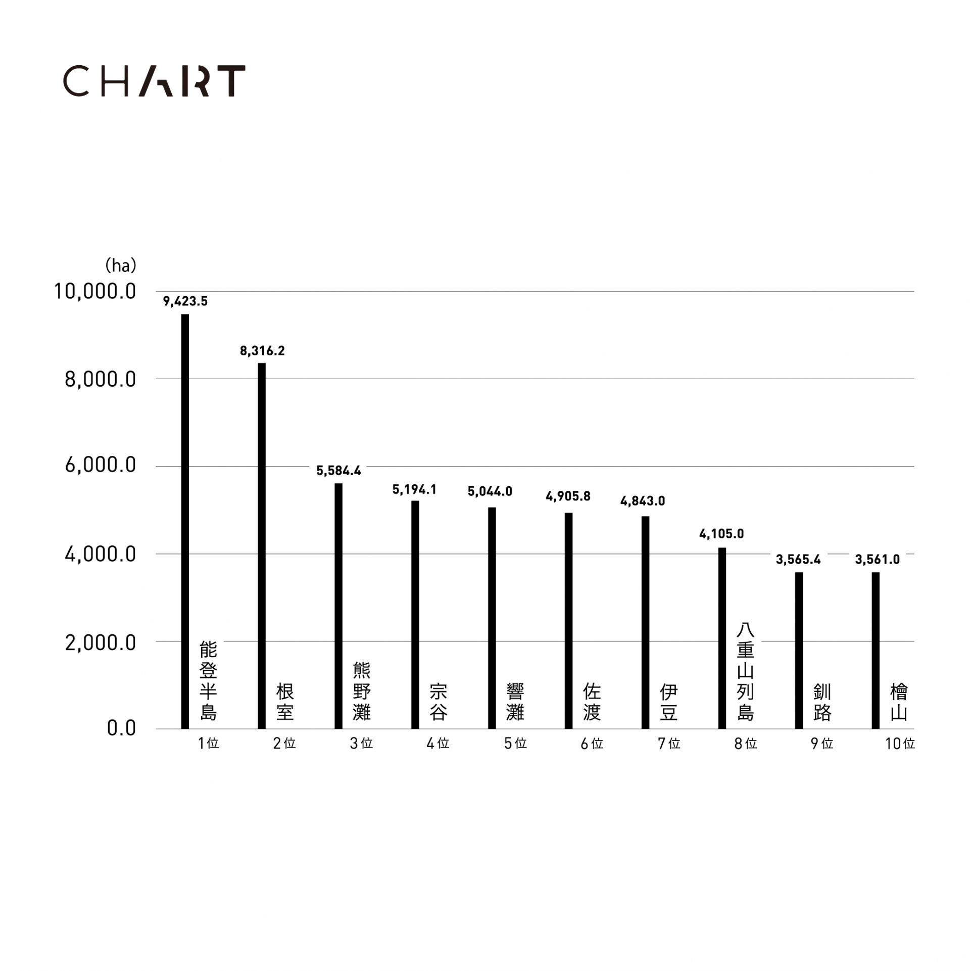 海藻・海草の森「藻場(もば)」。魚の産卵場所や隠れ家になるなど、海の生態系において重要な機能を担っていますが、その面積は世界的に減少し続けています。要因として、人間の経済活動による水質悪化や海岸線の改変等が大きく関与していると考えられています。能登半島沿岸の藻場は、海域単位で全国1位の面積(9,423.5ha)を誇り、絶滅危惧種の海洋生物も多数生息するといわれます。 | 出典:環境庁(1998)第5 回自然環境保全基礎調査(海辺調査) | グラフ提供:珠洲市