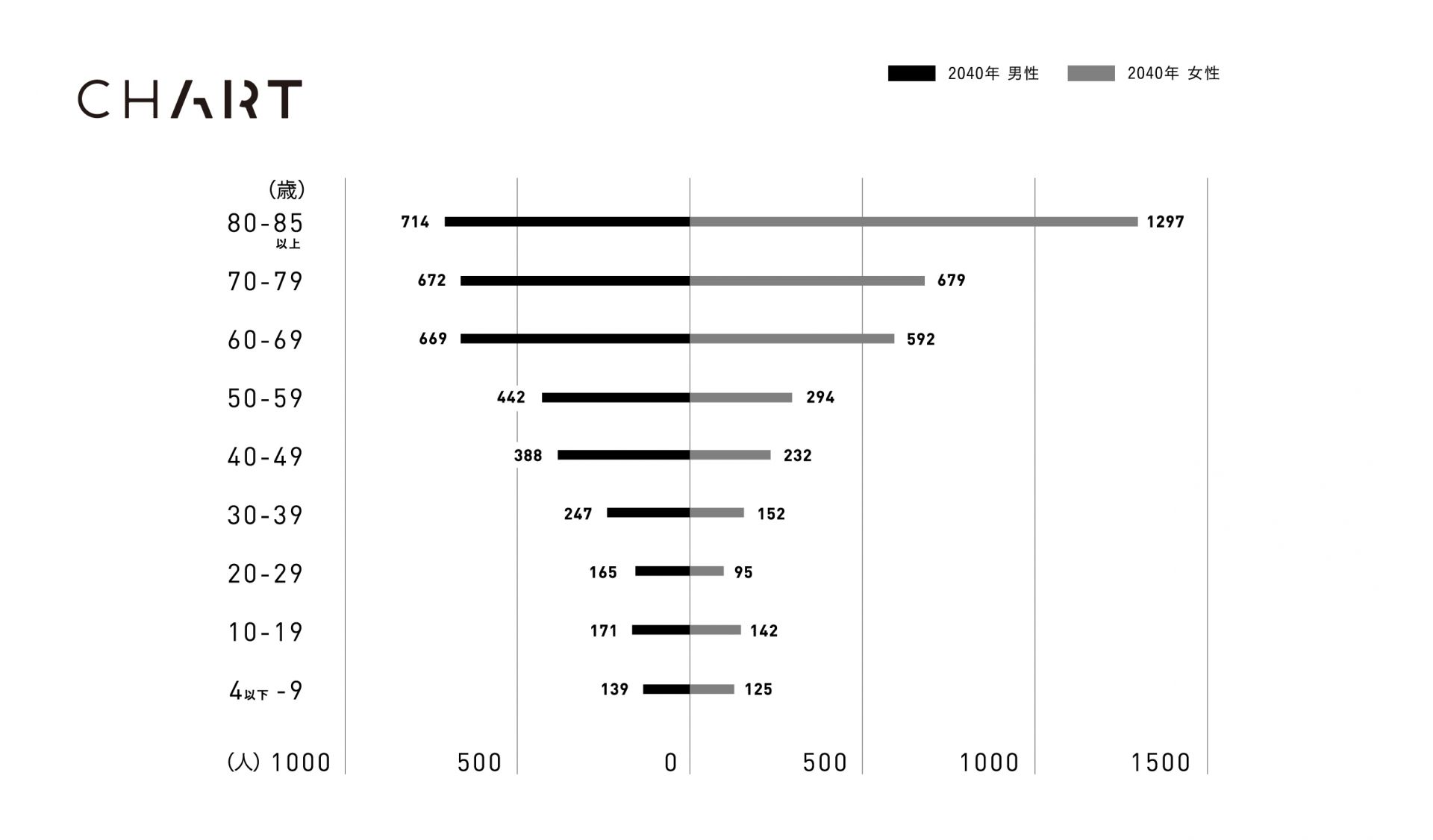作品を制作した2019年から約20 年後の2040年、珠洲市の人口が、各世代別にどのような人口比率になっているのかを予測した人口ピラミッドグラフです。高齢者が増え若者が少ないことを示す、典型的な逆三角形の形を描いています。若年層のなかでも、とくに20-29歳の層がもっとも少なくなっており、高等教育機関の空白地域であることが20代の流出につながっていると推察されます。 | 出典 : 国立社会保障・人口問題研究所の将来人口推計値(2019) | グラフ提供:珠洲市